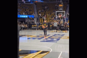 赛前热身库里走到中圈,他在logo处连续发射2球,全部穿网而过,展现逆天射术。