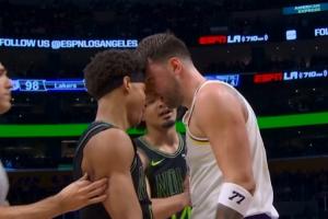 东契奇被鹈鹕新秀费尔斯犯规,很生气,和对手顶牛