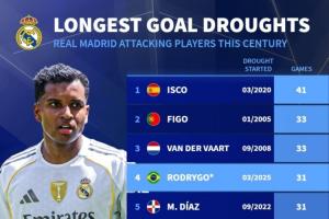 球荒继续罗德里戈31场球荒 是本世纪皇马进攻球员第4长的球荒