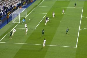 VAR介入,主裁观看回放后判罚点球,并对吕迪格出示黄牌!