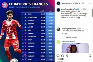 拜仁球员身价变化:卡尔上涨4000万欧,凯恩和穆西亚拉降1000万欧