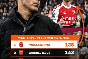 2024年8月以来,阿森纳球员在英超中首发时,梅里诺是进攻端最高效的球员,他每135分钟就直接参与1球,位居他身后的是热苏斯(142分钟)、哈弗茨(169分钟)以及约克雷斯(221分钟)。