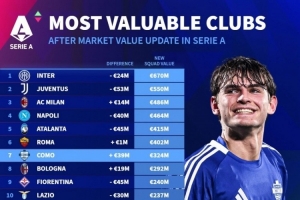 意甲球队身价榜:国米6.7亿欧居首,尤文、米兰、那不勒斯前四