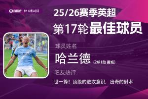 2025-2026赛季英超火热进行中,体育资讯和咪咕体育联合发起每轮英超最佳球员评选活动!第17轮评选结果已经出炉,曼城前锋哈兰德(42984票)力压罗杰斯(34236票),连续两轮当选!