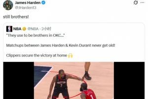 赛后,NBA官推晒出哈登与杜兰特对位的集锦,并配文道:“他们在雷霆时曾经是兄弟,哈登与杜兰特的对位百看不厌,快船在主场确保了胜利。”