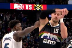 GIF-约基奇准备罚球,华子伸手扒拉一下,约基奇抱怨,华子说那咋了?裁判这里没吹罚。