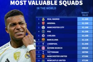 球队身价榜:皇马13.8亿欧力压枪手12.9亿,巴萨第6利物浦第7