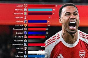 优势较大3队:阿森纳45分、曼城40岁、维拉39分