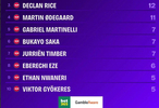阿森纳2025英超的全部比赛已经结束。数据网站squawka统计了2025阿森纳队内英超参与进球榜。