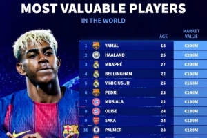 体育资讯1月1日讯 2025年已经结束,《转会市场》也列出了当前全球身价榜前二十的球员,亚马尔、哈兰德和姆巴佩均2亿欧最高。