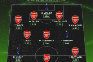 北伦敦德比评分最高阵:阿森纳8人热刺3人,约克雷斯在列,无萨卡